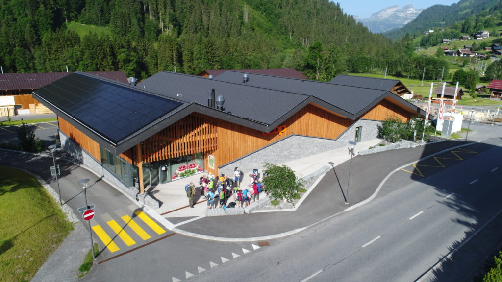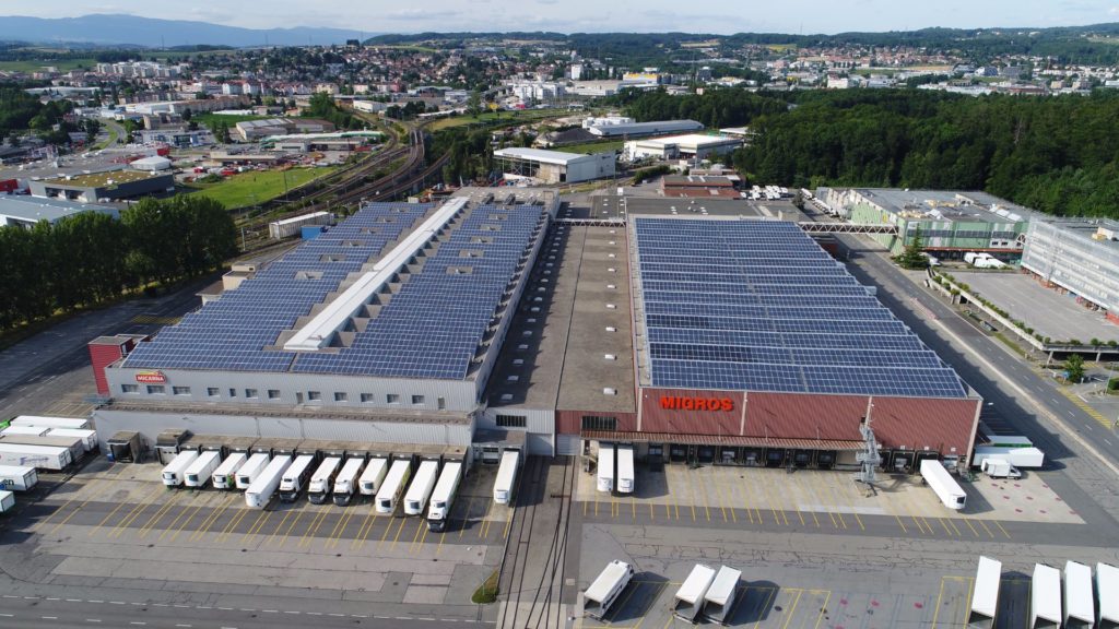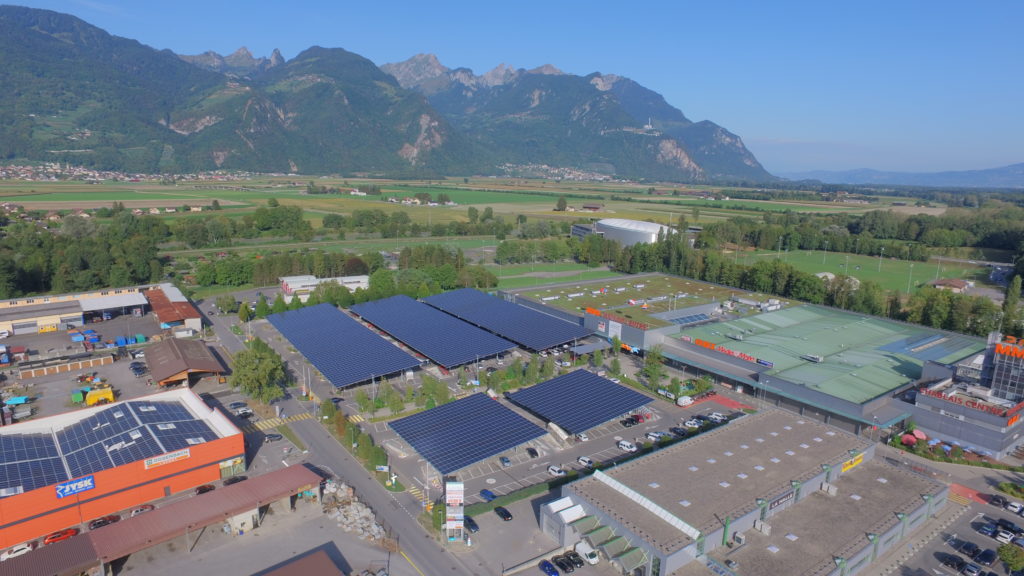 Carports solaires – MMM Chablais Centre Aigle Année & lieu du projet Conception 2016 -2017Réalisation 2018 Adresse : Chemin sous le Grand-Pré 4 – 1860 Aigle Caractéristiques Surface des panneaux photovoltaïques : 9’487 m2Production électrique : 1.8 Mio kWh Description Construction d’un parc solaire sur le parking commercial de Chablais Centre Migros Vaud à Aigle. Les carports solaires offrent un abri aux véhicules en stationnement tout en approvisionnant en énergie les commerces voisins, qui utiliseront 60 % de l’énergie produite. Galerie